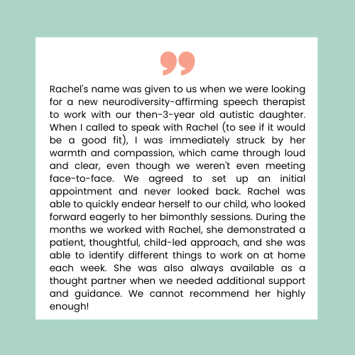 Rachel is a Meaningful Speech-trained clinician with experience using the Natural Language Acquisition framework to understand and support emerging autistic communication. She has assisted many, many autistic children in developing flexible, meaningful, self-generated sentences by embracing a gestalt-based framework and honoring this unique pathway to language development. Additionally, she has developed an AAC pageset based on a gestalt language approach, and her nonspeaking autistic clients have experienced increased expressive language when given an AAC system that reflects the way their brains are organized, rather than expecting them to conform to a neurotypical, analytic approach to symbolic communication. If you are wondering if Rachel's approach to speech therapy will work well for your autistic child, please schedule a free, twenty-minute consultation.